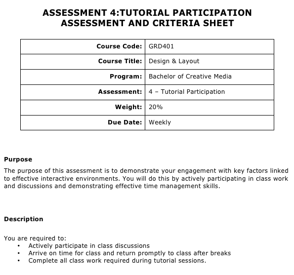 As part of your class mark for GRD401, I will be checking that you are posting weekly updates of what you have learned or discussed in class, and that you are commenting on other students’ posts. To really achieve high grades, ensure you do some reading of related materials (ideally by published experts in the field) on-which you are blogging, and include in-text referencing along with a references section at the end of your post.